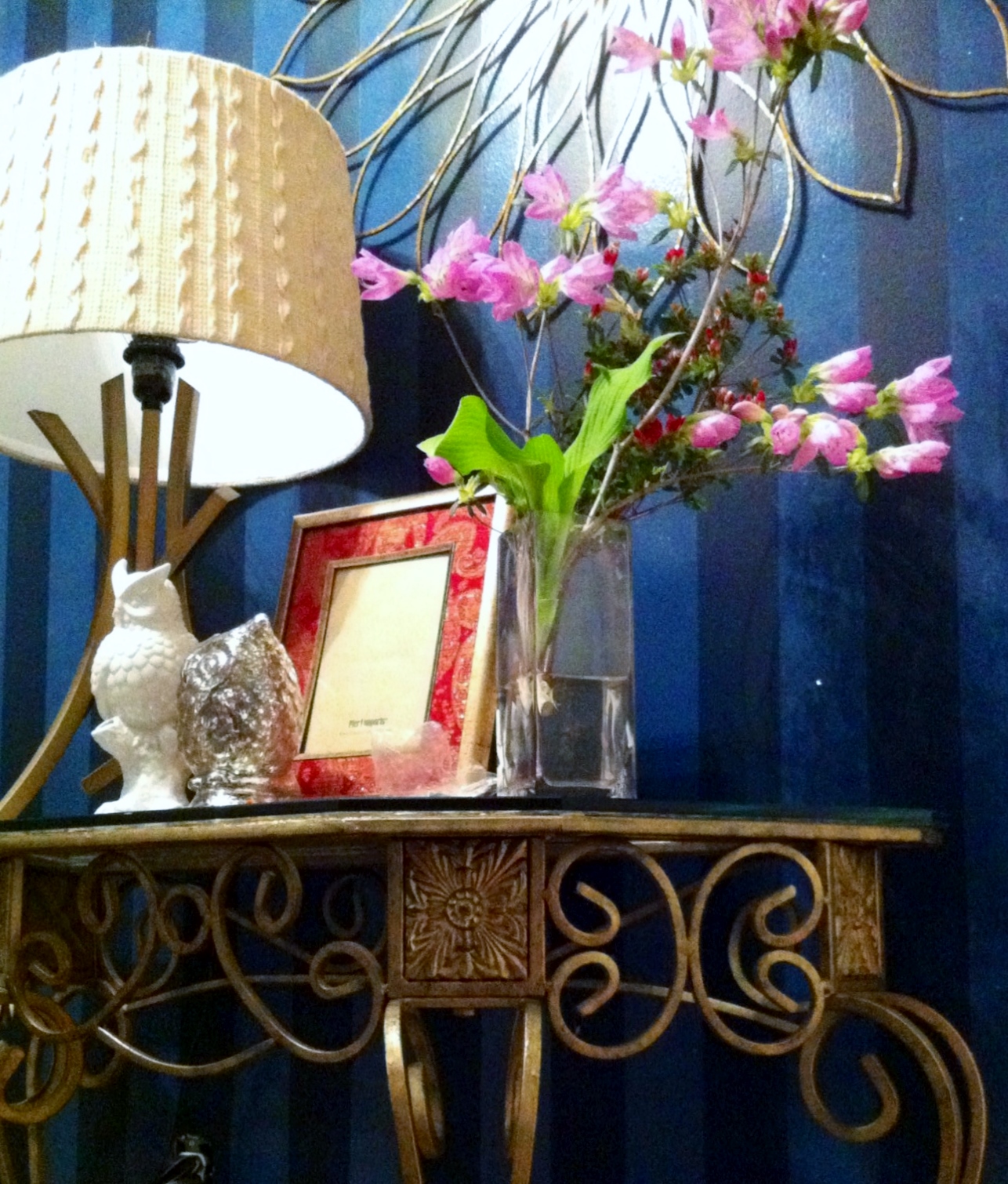 The little console table is one of my thrifty finds, the vintage iron and glass table has been with me for over 5 years now, purchased at that sale at that place that rents props for TV and movie productions I have mentioned here.